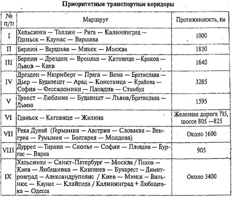 Исходя из принципов интегральной логистики, следует отметить международный аспект современной транспортной задачи. Опыт ряда стран свидетельствует о том, что благодаря выгодному географическому положению своих территорий они давно используют транзит в качестве существенного источника доходов. Существует концепция «транспортных узлов» и «транспортных коридоров». В ее основе лежит необходимость концентрации транспортных потоков на относительно узком географическом направлении, сосредоточение перевалки грузов в терминальных транспортных узлах, расположенных друг от друга на оптимальном с точки зрения эффективности использования автомобильного транспорта расстоянии. Для России в настоящее время экономически целесообразно развитие транспортных коридоров, так как это интенсифицирует использование транзитного потенциала страны, освоение растущих мировых грузопотоков. Стратегически важными являются Транссибирский коридор и мультимодальный транспортный коридор (МТК) «Север – Юг». Не менее перспективны с точки зрения включения России в общемировую транспортную сеть трасса Северного морского пути, паромные линии на Балтике, коридор для доставки грузов с Тихоокеанского побережья США в Северный Китай через российские порты Приморья и др. В систему международных транспортных коридоров входят также экспортные и транзитные магистральные трубопроводы, Наряду с сухопутными и водными коммуникациями значительным транспортным потенциалом обладает воздушное пространство России. В 1994 г. состоялась Критская панъевропейская транспортная конференция, которая установила в Европе 9 транспортных коридоров (см. табл. 5.3). Непосредственно Россию затрагивают коридоры первый, второй и девятый, которые в настоящее время дополняются новыми направлениями. Они были представлены на Третьей международной конференции по проблемам транспорта (Хельсинки, июнь 1997 г.). Дополнительные направления: 1. Балтика (Санкт-Петербург) – Центр (Москва) – Черное море (Новороссийск); 2. Москва,– Астрахань; 3. Запад (Берлин - Варшава – Минск) – Центр (Москва) – Нижний Новгород – Урал; 4. Северный морской путь; 5. Водный путь из региона Черного и Азовского морей через Волго-Донской канал в Каспийское море. Таким образом, транспортные коридоры – это часть международных интеграционных процессов. Важным решением конференции явилось то, что к категории «критских коридоров» (II и IX) отнесены дороги России, а коридор I включает Калининградскую область. Создание международных транспортных коридоров предусматривает не только слияние существующих магистралей в единый комплекс, но и приспособление действующей коммерческой практики к международным стандартам.