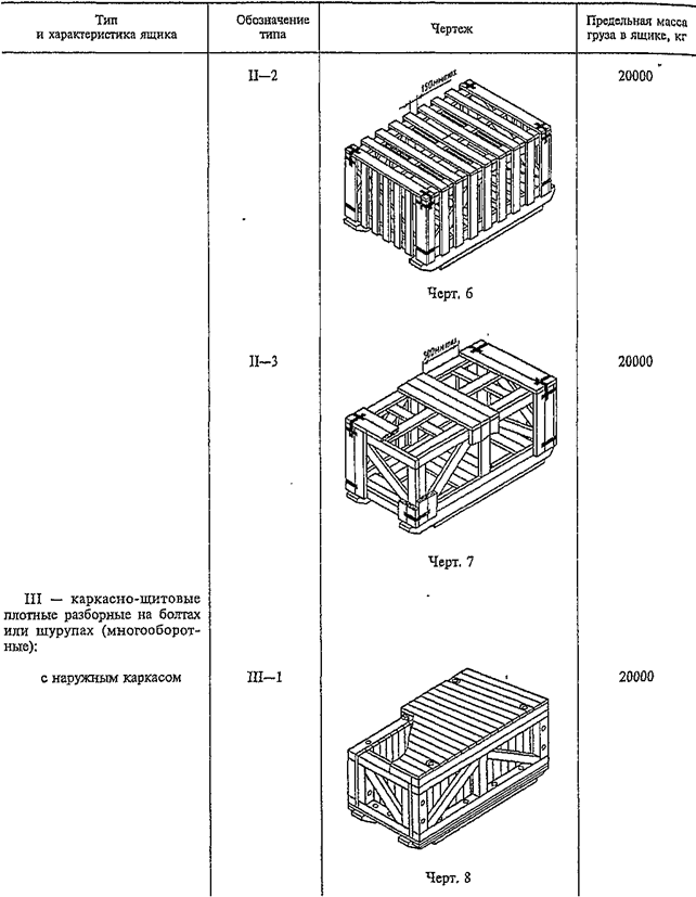 Допускается изготовлять ящики типов: I - с внутренним расположением планок и раскосов; с досками боковых стенок, дна и крышки, состоящими из двух отрезков при длине ящика более 4000 мм. Стыковка отрезков производится на планках пояса, при этом на каждой планке доски стыкуются через две и более; с полозьями; I-3, I-4, V - разборными, для грузов массой до 500 кг; I-3, II-1, III-1, IV-1 и V-1 - с решетчатым дном для грузов, имеющих сплошное жесткое основание, и для грузов, закрепленных на крепежных брусьях или полозьях, если это не влияет на сохранность и качество грузов; I-3, I-4, II, III, IV, V и VIII - с полозьями и продольными брусьями боковых стенок длиной более 4000 мм, составными по длине в соответствии с приложением 4, причем стыки отдельных отрезков не должны находиться на одном уровне; с полозьями, составными по ширине, в соответствии с приложением 5; с полозьями или дном из профильного проката (двутавр, швеллер), при этом предельные допустимые изгибающие моменты должны быть одинаковыми M_пред.с = М_пред.д; с применением брусьев, стоек, раскосов щитов и досок крышки других сечений, без уменьшения момента сопротивления изгибу; с досками дна, составными по длине, при трех и более полозьях, со стыковкой по оси полоза шириной не менее 125 мм; II-1 и II-2 - с горизонтальным расположением досок обшивки торцовых стенок и установкой угловых стоек только на торцовых стенках для грузов массой до 3000 кг; II-2, IV-2 - с плотным дном и крышкой, с плотной крышкой; II и III-1 - с дополнительными продольными планками сечением 40x60 мм по краям на дне ящика, прибиваемыми к доскам дна, для ящиков типа II - с внутренней стороны, для ящиков типа III-1 - с наружной стороны. При креплении боковых стенок длиной и высотой более 2000 мм, а также в случае установки боковых стенок на полозья доски дна должны быть смещены или уменьшены по ширине на толщину досок обшивки. При ширине ящика свыше 1000 мм устанавливается дополнительная продольная планка посередине ящика; II и IV - с досками обшивки, состоящими из двух отрезков, при высоте ящика более 2000 мм, при этом стыковка производится по оси среднего горизонтального бруса шириной не менее 100 мм; III - решетчатыми с величиной просвета между досками не более 100 мм; III-1 - с перекрытием торцовых стенок боковыми; IV-2 - с обшивкой решетчатыми щитами шириной от 700 до 1000 мм с просветами между деталями щита до 400 мм для боковых и торцовых стенок; V - с раскосами; VII, VIII - для ящиков длиной или высотой более 2000 мм с дополнительными продольными брусьями, прибиваемыми с внутренней стороны ящика к доскам дна; с прорезями в продольных и крайних поперечных деталях крышки рамной конструкции для обеспечения стока воды; VIII - с решетчатым дном и крышкой, если это не влияет на сохранность и качество груза; VIII-1 с облегченным каркасом и крышкой рамной конструкции, нештабелируемые, перевозимые железнодорожным и автомобильным транспортом; VIII-4 - облегченными, нештабелируемыми для грузов массой до 5000 кг, с крышкой рамной конструкций с обшивкой листовыми древесными материалами; VIII-4 - с обшивкой стенок и крышки древесно-волокнистой плитой, находящейся между досками, расположенными во взаимно перпендикулярном направлении, с обшивкой фанерой с наружным расположением деталей; II, IV, VIII - по форме отличающиеся от параллелепипеда (ящики со скошенными верхними углами с защитой отдельных выступающих частей изделия или с дву