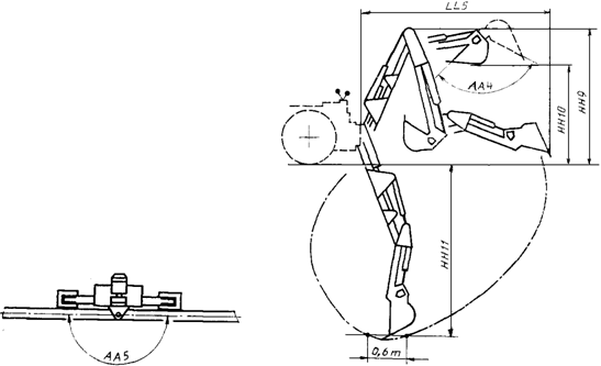 ------------------------------------------------------------------------------------- LL5 Вылет режу- Расстояние по координате X между щей кромки двумя плоскостями X, одна из кото- ковша от оси рых проходит через ось вращения вращения поворотной колонки, другая - через поворотной наиболее выступающую вперед точку колонки режущей кромки ковша обратной лопаты при установке стрелы в положение максимального вылета