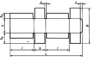 L - длина развертки, мм; B - ширина развертки, мм; l, b, h - внутренние размеры ящика (длина, ширина, высота), мм; S - толщина картона, мм;