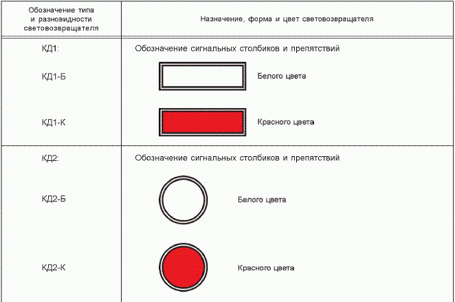 3.1. В настоящем стандарте применены следующие термины с соответствующими определениями: 3.1.1. Световозвращатель (катафот) дорожный: светосигнальное устройство со световозвращающим элементом (элементами) и элементами крепления, служащее для обозначения направления движения или местонахождения препятствия на дороге в темное время суток. 3.1.2. Световозвращающий элемент: часть световозвращателя дорожного с оптическими элементами (элементом), отражающими свет. 3.1.3. Оптический элемент: оптическая система, отражающая свет в направлении, близком к направлению его падения. 3.1.4. Рабочая поверхность оптического элемента: поверхность (грани) оптического элемента, обеспечивающие эффект световозвращения. 3.2. В настоящем стандарте применены следующие сокращения и обозначения: КД - световозвращатель (катафот) дорожный; КД1, КД2 - световозвращатели для обозначения сигнальных столбиков и препятствий; КД3 - световозвращатель для разделения транспортных потоков противоположных и попутных направлений движения, обозначения пешеходных переходов и искусственных неровностей; КД4 - световозвращатель для обозначения участков проезжей части, на которые запрещен въезд; КД5 - световозвращатель для обозначения дорожных ограждений; КД6 (1, 2) - световозвращатель для обозначения двусторонних дорожных ограждений на разделительной полосе; Б - белый цвет световозвращающего элемента; К - красный цвет световозвращающего элемента; Ж - желтый цвет световозвращающего элемента; 1 - односторонние световозвращатели; 2 - двухсторонние световозвращатели; ВП - класс световозвращателя по механической прочности (высоте падения испытательного груза). Примечание. Обозначение КД5-К1 следует читать: световозвращатель для обозначения дорожных ограждений красного цвета, односторонний.